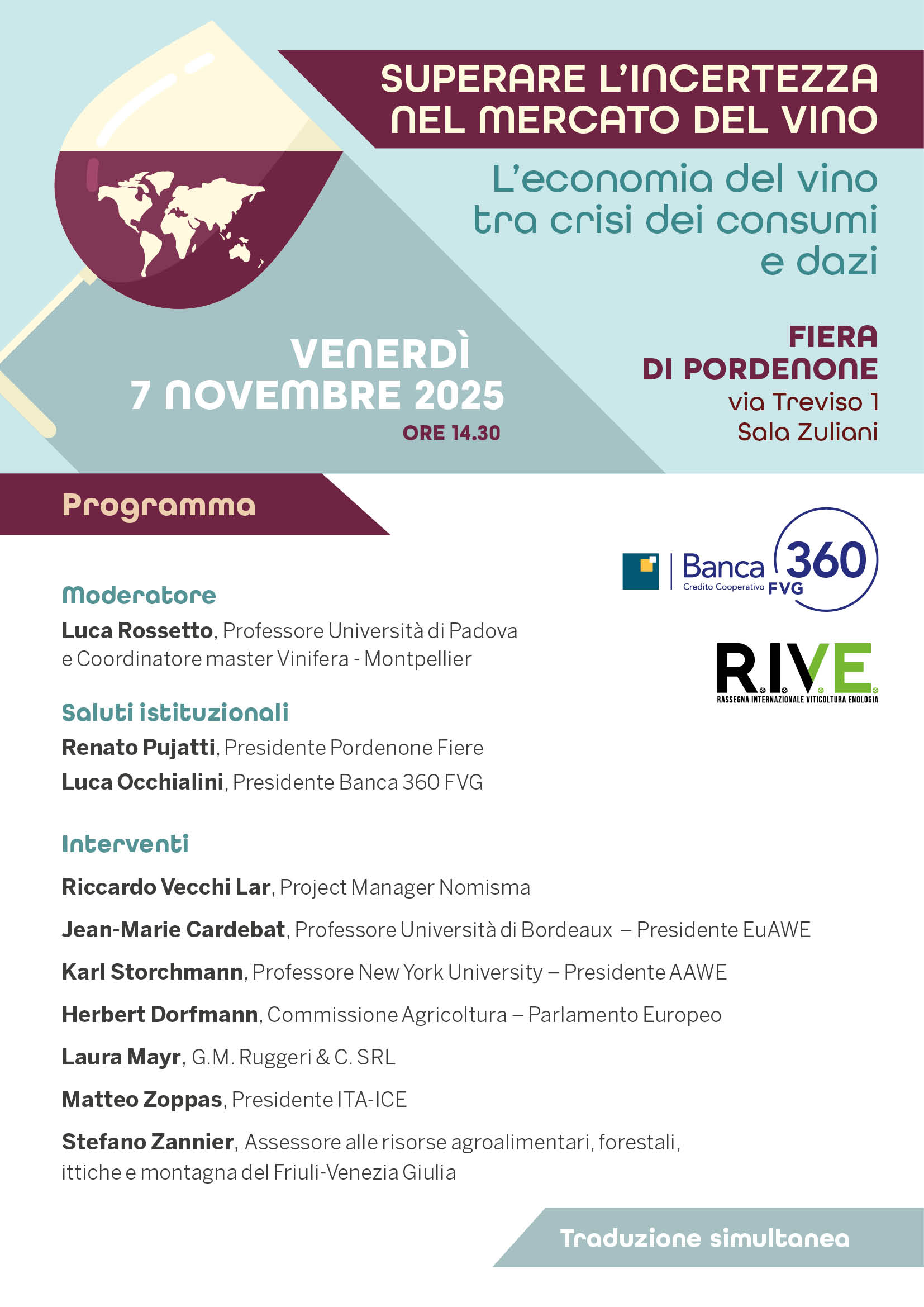 È in questo scenario che, insieme alla fiera R.I.V.E. – Rassegna Internazionale di Viticoltura ed Enologia, abbiamo scelto di promuovere un convegno rivolto agli operatori del settore, con l’obiettivo di offrire un’occasione di confronto, analisi e visione strategica.